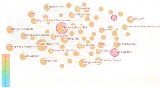 The top ten institutions by publication volume are presented in Table 6. Wuhan University recorded the highest number of publications, totaling 63, among all research institutions. The remaining top-ranking institutions, ordered by publication volume, are as follows: Chinese Academy of Sciences (59 publications); University of Hong Kong (34 publications); Tsinghua University (34 publications); China University of Geosciences (31 publications); Hong Kong Polytechnic University (30 publications); Peking University (29 publications); National University of Singapore (28 publications); King Saud University (28 publications); and Tongji University (26 publications).