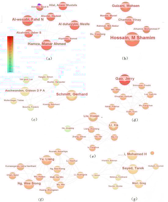 Author Collaboration Network. (a) The group with the highest output; (b) The second highest output group; (c) The forth highest output group; (d) The fifth highest output group; (e) The seventh highest output group; (f) The third highest output group; (g) The sixth highest output group.