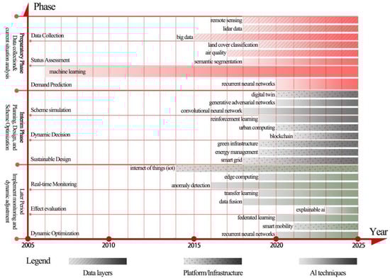 The concept of artificial intelligence (AI) was first conceptualized in 1942 and has traversed multiple evolutionary stages [1] while achieving extensive implementation across diverse disciplines [2,3,4,5,6]. In urban planning, the development has evolved from the early adoption of CAD, GIS, and BIM technologies to the continuous development of algorithms, including machine learning and deep learning. Today, breakthroughs driven by the Fourth Industrial Revolution, along with the emergence of generative AI and explainable AI, have provided new opportunities for the transformation and innovation of urban planning [1,6]. Currently, AI technologies have been applied in various domains of urban planning, including transportation system optimization [7,8,9,10,11], land use and spatial design [12,13,14,15,16,17], environmental and energy management [18,19,20,21,22,23], and public health and safety [24,25,26,27,28,29]. However, significant challenges and bottlenecks remain in areas such as cross-scale urban system integration [30,31,32,33,34,35], technological inclusiveness and adaptability [36,37,38,39,40], and the alignment of theory and policy [38,41,42], mainly due to the lack of effective coordination of AI technologies at the macro level. With the intensification of urbanization, problems such as environmental degradation and traffic congestion have become increasingly prominent [43,44], and urban issues are growing more diverse and complex. As urbanization rates continue to rise [45,46] and living standards improve, urban planning demands a higher quantity, efficiency, and accuracy of data processing [47,48,49,50]. Integrating planning, construction, management, and operation has become an inevitable trend in urban planning. Traditional planning approaches do not address increasingly complex, dynamic, and refined urban problems. Overcoming the limitations of experience-based planning and data constraints has become imperative, and AI technologies are now essential for driving reform and transformation in urban planning [50,51,52].