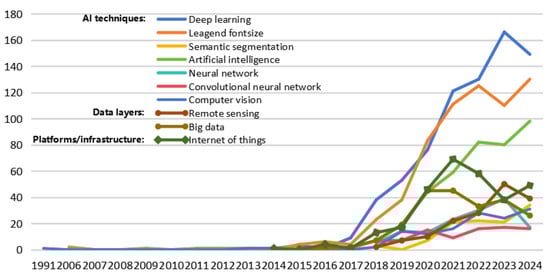 This stage was marked by a surge in scholarly output, with 770 publications contributing to the body of knowledge. Since 2018, the annual volume of publications rose sharply from approximately 20 in the preceding three years to 142, with a three-year trend of exponential growth. The concept of the “smart city” gained increasing traction and visibility [77,78,79], and urban planning began to receive significant attention [51]. The “Internet of Things (IoT)”, which emerged as a research hotspot at the end of the first stage, continued to demonstrate robust developmental momentum [80,81]. New research themes such as the “smart grid” [82,83] and “green space” [84,85] emerged [86,87,88], indicating that urban development was increasingly oriented toward digitization and sustainability across diverse application scenarios. Technologies such as “image segmentation”, “scene classification”, and “space syntax” also matured during this phase [12,89], and remote sensing technologies became more widely adopted [90,91,92]. “Machine learning” remained the core of AI technologies and continued to evolve, with deep learning based on multi-layer neural networks achieving particularly prominent results in this phase.