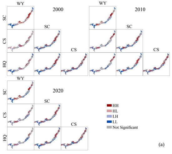 Compared to grid scale, the county scale amplified regional spatial divergence and polarization trends (Figure 5). At this scale, high and low-value clusters of ESs showed sharper boundaries. For instance, high WY values formed contiguous concentrations in southern Pearl River Delta counties and partial northeastern sectors. The SC maintained analogous spatial distributions across scales. The CS demonstrated insignificant variation over time, with high-value zones principally distributed within the Pearl River Delta. The high-value clustering areas of HQ are mainly preserved in northeastern territories, though their spatial extent displayed contraction at county-level resolutions.