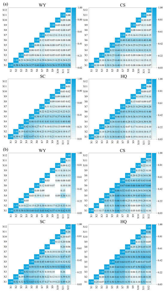 Figure 9 illustrates that the explanatory capacity of interacting factors is substantially greater than that of single variables. For WY, the interaction between X1 and other variables has the strongest effects, with the interaction between X1 and X7 yielding q values of 0.64, 0.65, and 0.59 across the three scales. In contrast, the interaction explanatory power between X3 and X6 is less than 0.1 at the grid and county scales, but reaches 0.70 at the city level. For SC, the interactions between X4, X5, and X6 and other drivers exhibit the highest explanatory capacity, especially between X1 and X4, with q-values of 0.52, 0.72, and 0.61 across the three scales. For CS, the interaction involving X6 consistently demonstrates the highest explanatory power across all scales. For HQ, with the exception of the interaction explanatory power between X2 and X7 at the city level being 0.18, the interactions between X4, X5, X6, and X7 and other factors have the highest q-values at the three scales.