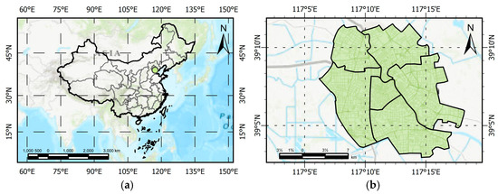 Map of the study area. (a) Global location; (b) Detailed boundary of Tianjin’s central urban area. (Source of figure: produced by the author).