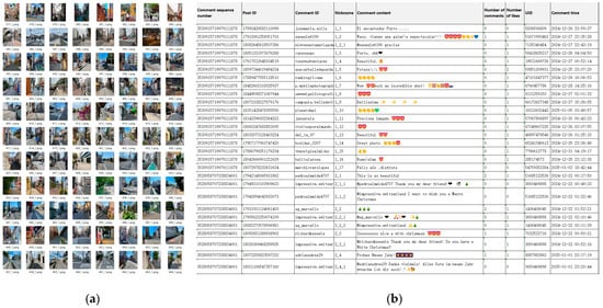 This figure presents the collected INS city-related street view data. (a) Images from 2817 INS posts related to urban street views, with each image named sequentially according to the order in which the posts were collected; (b) The corresponding 21,213 textual comments extracted from the same 2817 INS posts, containing metadata such as Post ID, Comment ID, Nickname, Comment Sequence Number, Comment Content, Number of Comments, etc. The comments are named sequentially following the order of the collected posts, with primary comments and secondary comments labeled progressively.