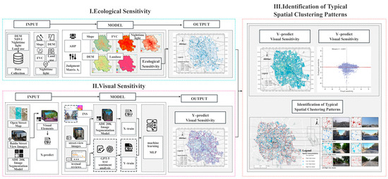 This study focuses on analyzing the spatial relationship between ecological sensitivity and visual sensitivity. The methodological framework is divided into two components: ecological sensitivity and visual sensitivity, as illustrated in Figure 4. Research Framework.