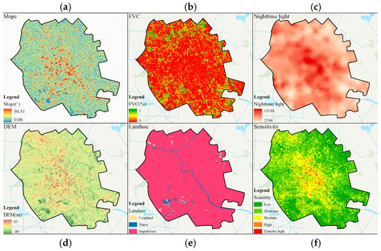 Ecological Sensitivity of the Central Urban Area of Tianjin. (a) Slope; (b) FVC; (c) Nighttime light; (d) DEM; (e) Land use; (f) Sensitivity; (Source of figure: produced by the author).