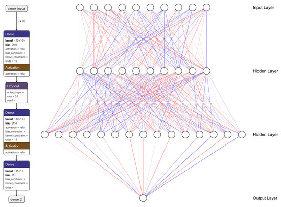 Integrating results from image segmentation and sentiment analysis of textual evaluations, this study employed the MLP algorithm to establish a social media-driven street-level visual ecological sensitivity perception model. The MLP algorithm, as a classical neural network model, can identify complex non-linear relationships among large sets of input features and achieve accurate predictive modeling through training [61,62]. The neural network was constructed using the TensorFlow framework based on Python and libraries such as Keras [63,64]. Input features for the MLP algorithm included street-view elements extracted from image segmentation. As illustrated, the model-building process consisted of an InputLayer, two hidden Dense layers containing 10 and 15 neurons, respectively, and a Dropout layer to prevent overfitting. Finally, a single-neuron Dense layer was used to predict visual sensitivity values (Figure 6).