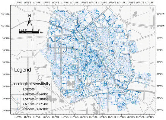 The results reveal significant spatial disparities in ecological sensitivity across the study area. Overall, higher ecological sensitivity is observed in the urban core, particularly concentrated in commercial hubs, intersections of major arterial roads, and areas characterized by high-density development. In contrast, the ecological sensitivity in peripheral zones is relatively low. The ecological sensitivity index ranges from 2.3225 to 3.3630 and tends to increase with intensifying urban land use.