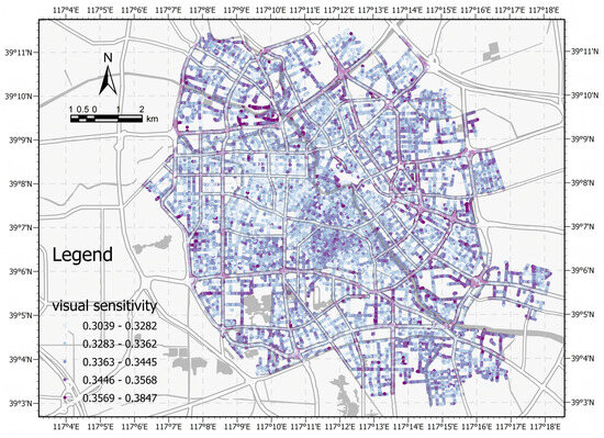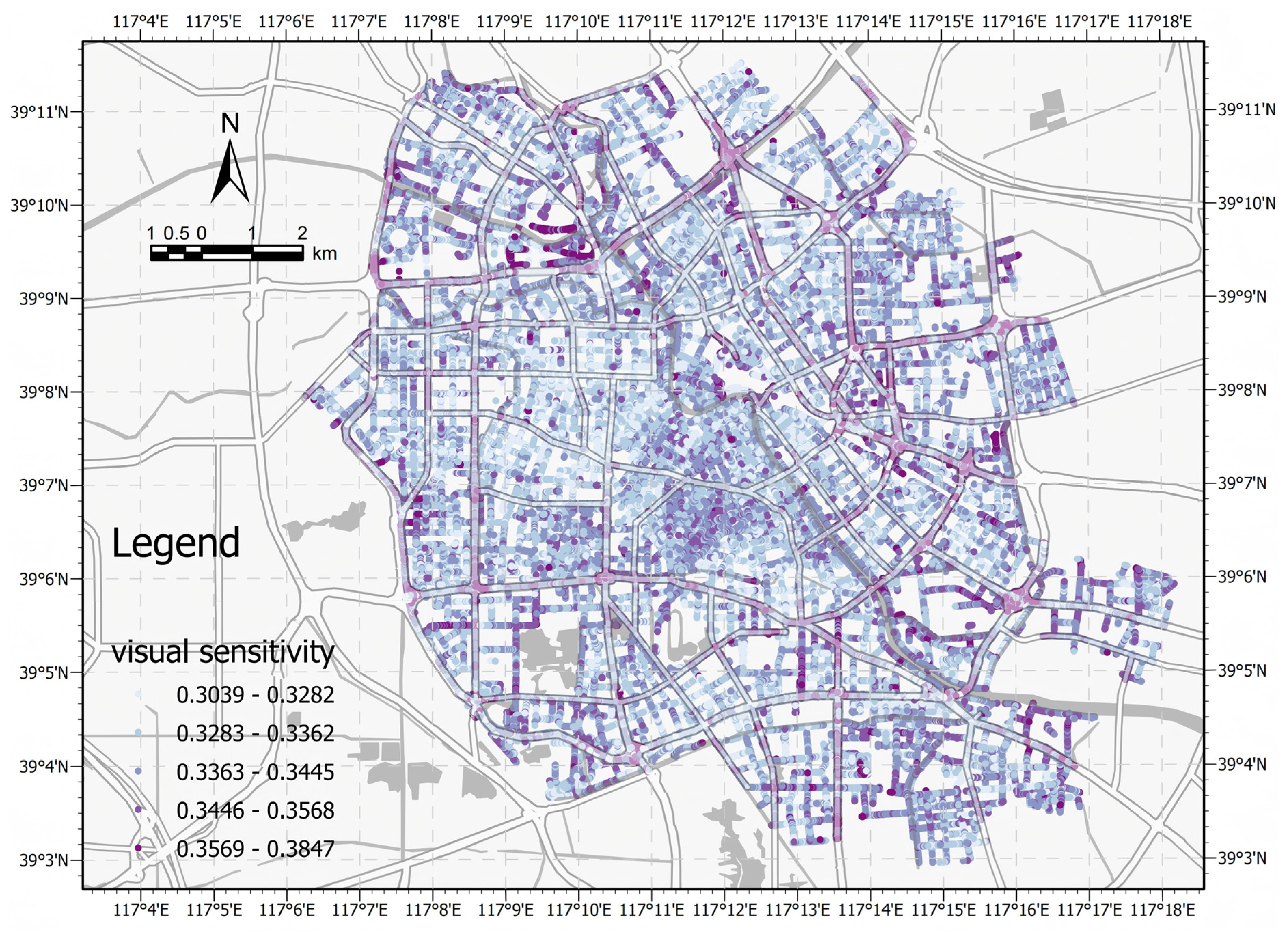The results indicate that visual sensitivity is higher in the central urban area, particularly around commercial hubs, major transportation nodes, and cultural landmarks such as Binjiang Road, Wudadao (Five Great Avenues), and the Italian Style Street in Tianjin. Additionally, there is no significant difference in visual sensitivity between primary and secondary roads, with a clustered distribution pattern. This may be due to similar characteristics in building density and traffic flow, leading to a comparable perception of visual sensitivity across these road types.