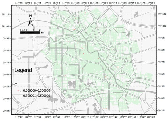 High ecological sensitivity areas are often closely associated with zones of functional complexity, such as commercial or historical-cultural districts, and areas with high traffic density. In contrast, low ecological sensitivity areas are typically related to urban green spaces, water systems, or low-intensity development zones. Areas with high ecological sensitivity are mostly concentrated in commercial cores or historical building clusters, where extensive hard paving, scarce green spaces, and heavy traffic result in weaker ecological carrying capacity. Medium sensitivity areas are generally located in mixed-use zones or older residential neighborhoods—for example, residential areas in Nankai and Hongqiao Districts—where green coverage is relatively low but not entirely impervious, placing their ecological sensitivity at a moderate level. Low ecological sensitivity areas are mainly found in newly developed zones or regions with abundant greenery, such as the vicinity of Shuixi Park, characterized by a strong ecological foundation and minimal environmental disturbance.