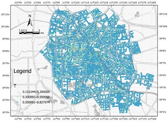 By constructing the Visual Sensitivity MLP Model, the independent variables extracted from Baidu street-view images of Tianjin’s central urban area—including Road, Building, People, Mountain, Sky, Plant, TS, Water, AB, and Vehicle—were set as predictor variables. These variables were input into the model, generating visual sensitivity values based on social media data (Figure 8).
