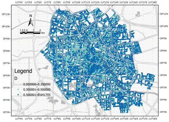 Figure 10 illustrates the spatial distribution pattern of the coupling coordination degree (D) between ecological sensitivity and visual sensitivity across 56,210 street-level points in the central urban area of Tianjin. Among these points, 40,944 (72.82%) have D values greater than 0.5, indicating a high level of consistency between the two dimensions in most areas. These “highly coupled regions” are primarily concentrated in the city’s core zones, including waterfront green corridors, major road axes, cultural tourism nodes, and streets with high green-view rates, such as the Haihe River corridor, the Wudadao area, and the surroundings of Gulou. In contrast, only 129 points (D < 0.3) exhibit poor coupling coordination, scattered in enclosed nodes along the urban periphery and major traffic arteries, with a very limited spatial extent. Overall, the ecological and perceptual systems in Tianjin’s central districts demonstrate a highly coupled and coordinated spatial pattern.