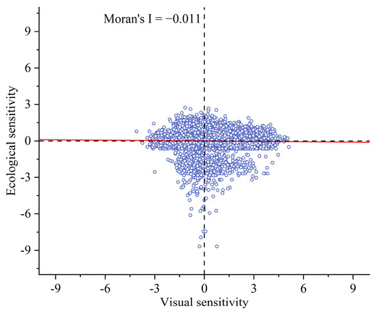 This study employed a bivariate Moran’s I analysis to examine the spatial autocorrelation between visual sensitivity and ecological sensitivity in the central urban area of Tianjin. By constructing a spatial analysis model with visual sensitivity as the independent variable and ecological sensitivity as the dependent variable, a global Moran’s I scatter plot was generated (Figure 11).