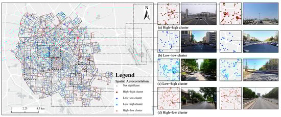 LH areas possess favorable ecological conditions but lack public attention due to spatial enclosure, weak accessibility, or deteriorated interfaces. Typical examples include old alleyways or streets surrounded by hedges. Such areas should enhance openness, visibility, and accessibility to better realize their ecological value. In contrast, HL areas, although characterized by weak ecological capacity, attract significant public attention through their prominent spatial forms and visual focal functions—such as intersections, historic façades, or elevated road crossings. These areas have become visual hotspots of urban public activity and thus require urgent ecological micro-renewal or green interventions.