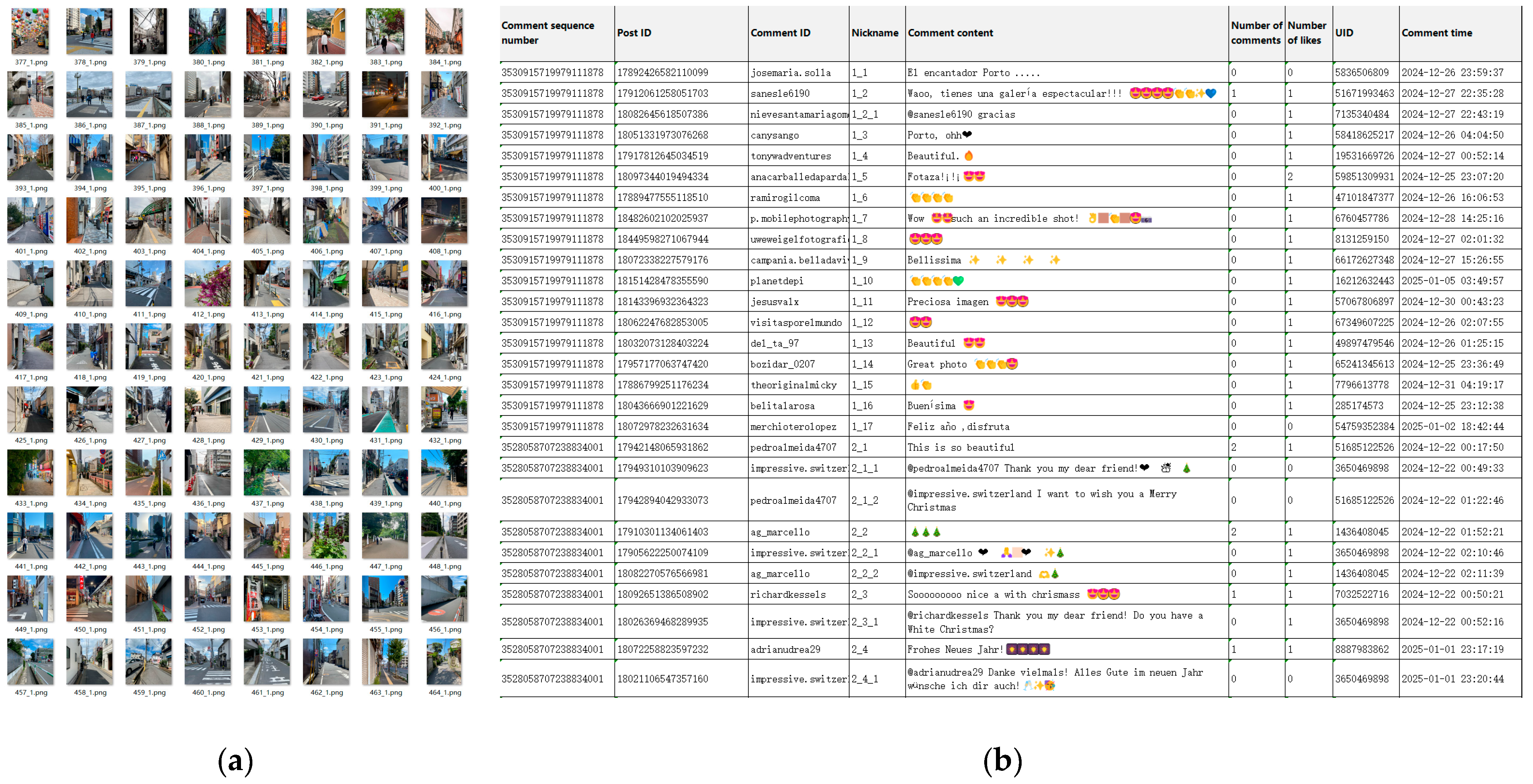 Figure 2. This figure presents the collected INS city-related street view data. (a) Images from 2817 INS posts related to urban street views, with each image named sequentially according to the order in which the posts were collected; (b) The corresponding 21,213 textual comments extracted from the same 2817 INS posts, containing metadata such as Post ID, Comment ID, Nickname, Comment Sequence Number, Comment Content, Number of Comments, etc. The comments are named sequentially following the order of the collected posts, with primary comments and secondary comments labeled progressively.