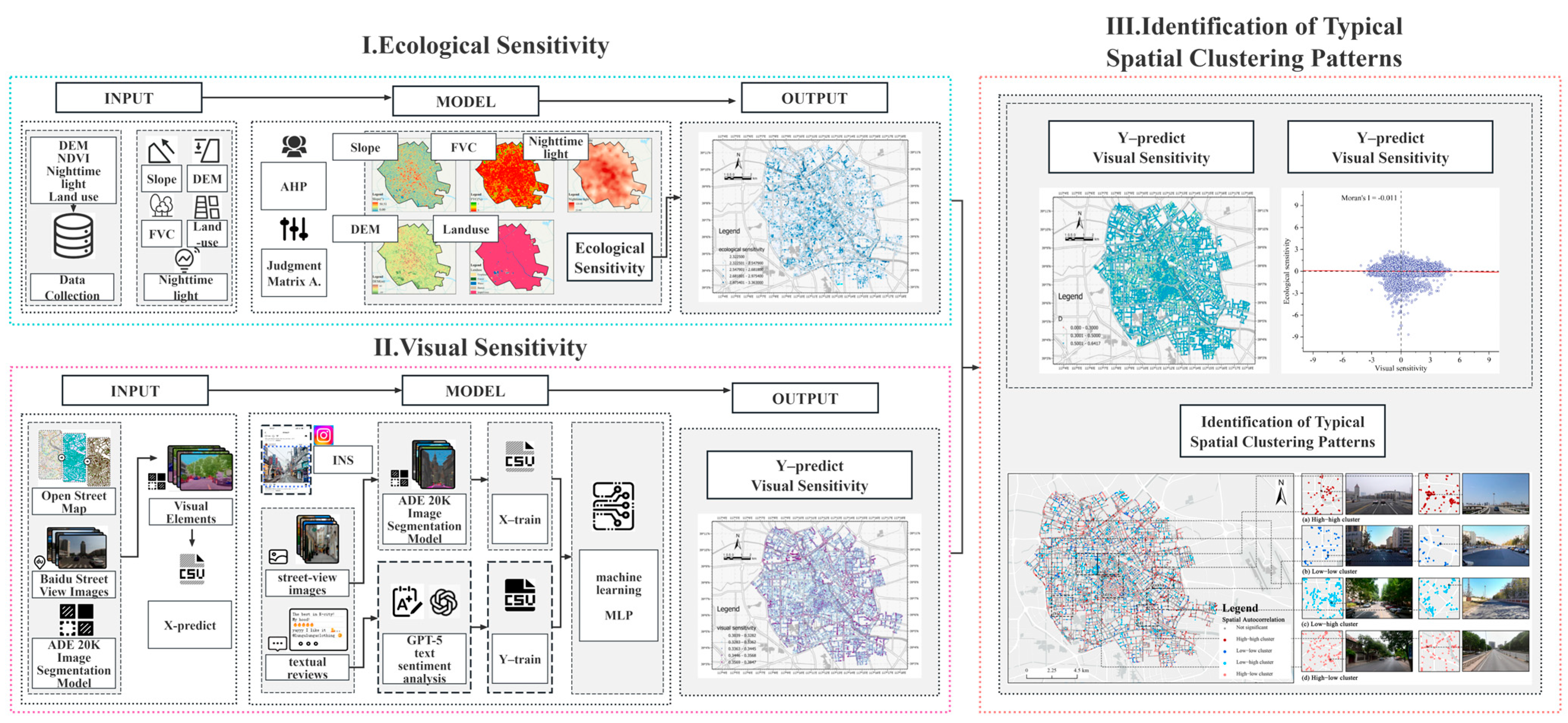 Ecological sensitivity refers to the adaptive capacity of ecosystems to cope with natural environmental changes and human disturbances without compromising ecological quality [6]. It is a critical component of ecological planning and environmental protection [7]. For instance, Xu et al. (2023) employed the CRITIC method to develop an ecological sensitivity evaluation model based on indicators such as topography, climate, and vegetation, enabling the identification of ecologically fragile areas and the proposal of targeted protection strategies [8]. Bai and Guo (2021) constructed an indicator system comprising five categories—including land use change, normalized difference vegetation index (NDVI) variation, distance to water bodies, slope, and fragmentation of ecological land—to support urban ecological spatial regulation and the enhancement of ecological connectivity [9]. Although current research has made progress in systematically integrating multi-source environmental data to improve the accuracy and spatial resolution of ecological sensitivity assessments, it often overlooks public perceptions and emotional responses to spatial environments. Traditional expert-driven evaluation methods, such as the Analytic Hierarchy Process (AHP), focus primarily on objective ecological indicators and struggle to capture the dynamic visual perception of urban spaces. Moreover, they seldom account for human subjective experience and cultural values, which limits the accuracy and broad applicability of these assessments. In particular, under the context of rapid urbanization, public spatial perception plays a crucial role in the effectiveness of urban ecological governance; however, this dimension has yet to be incorporated into existing ecological sensitivity assessment frameworks.