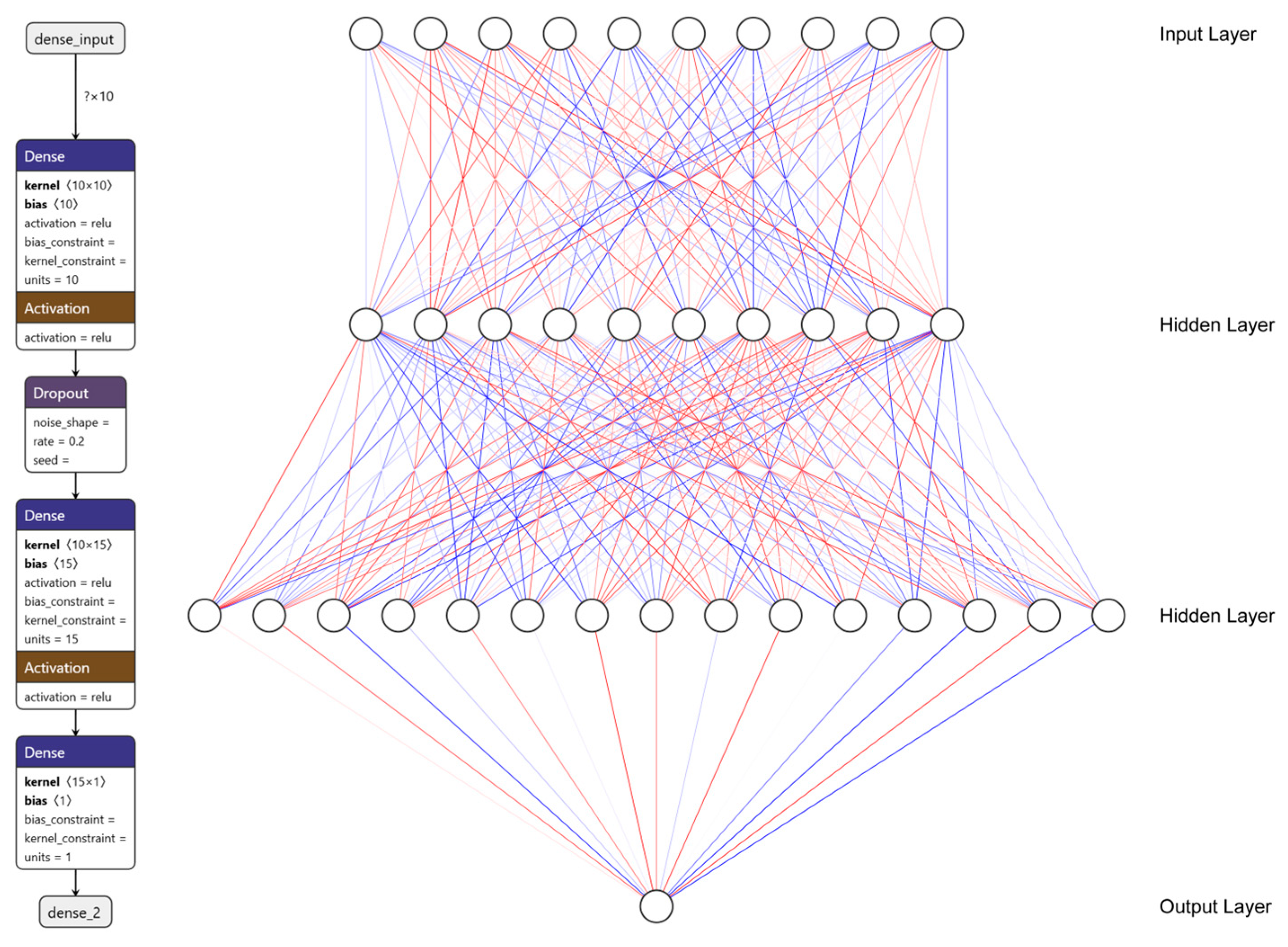 Figure 6. Schematic diagram of the neural network model construction process. Red lines indicate positive connection weights, while blue lines indicate negative connection weights between neurons. (Source of figure: produced by the author).