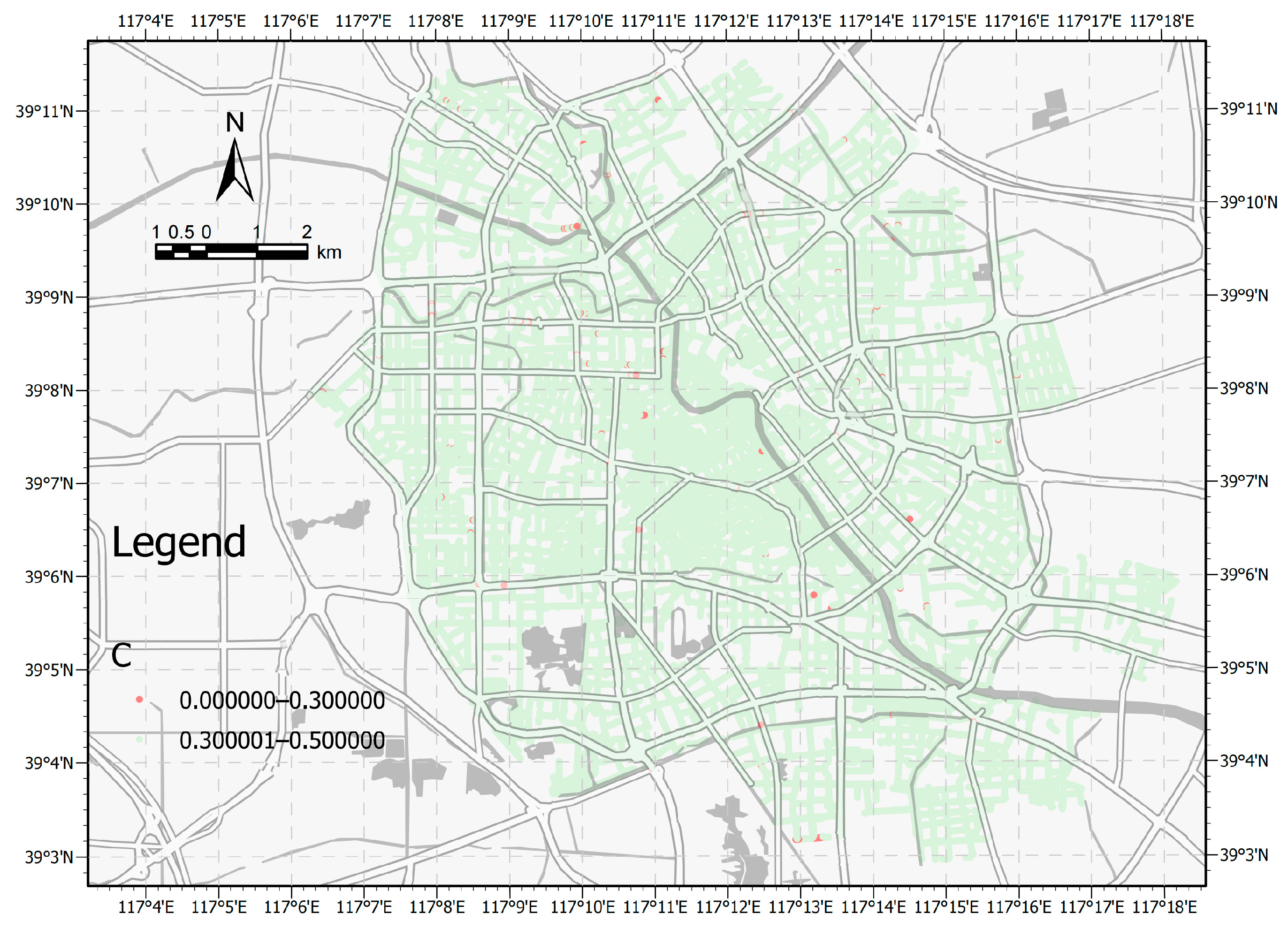 Highly sensitive zones are predominantly located at key transportation nodes, high-density urban blocks, and functionally complex areas in the city center—particularly along the junction of Heping, Hexi, and Nankai districts. Examples include the Binjiangdao commercial area, surroundings of Tianjin Railway Station, and the vicinity of the Gulou historical district. Moderately sensitive areas are distributed in a belt-like manner, aligning with primary and secondary road networks and forming a radial pattern. In contrast, low-sensitivity regions are concentrated in the outskirts, such as around Tianjin South Railway Station and the borders of Xiqing and Jinnan districts, where the distribution is more dispersed or patchy.