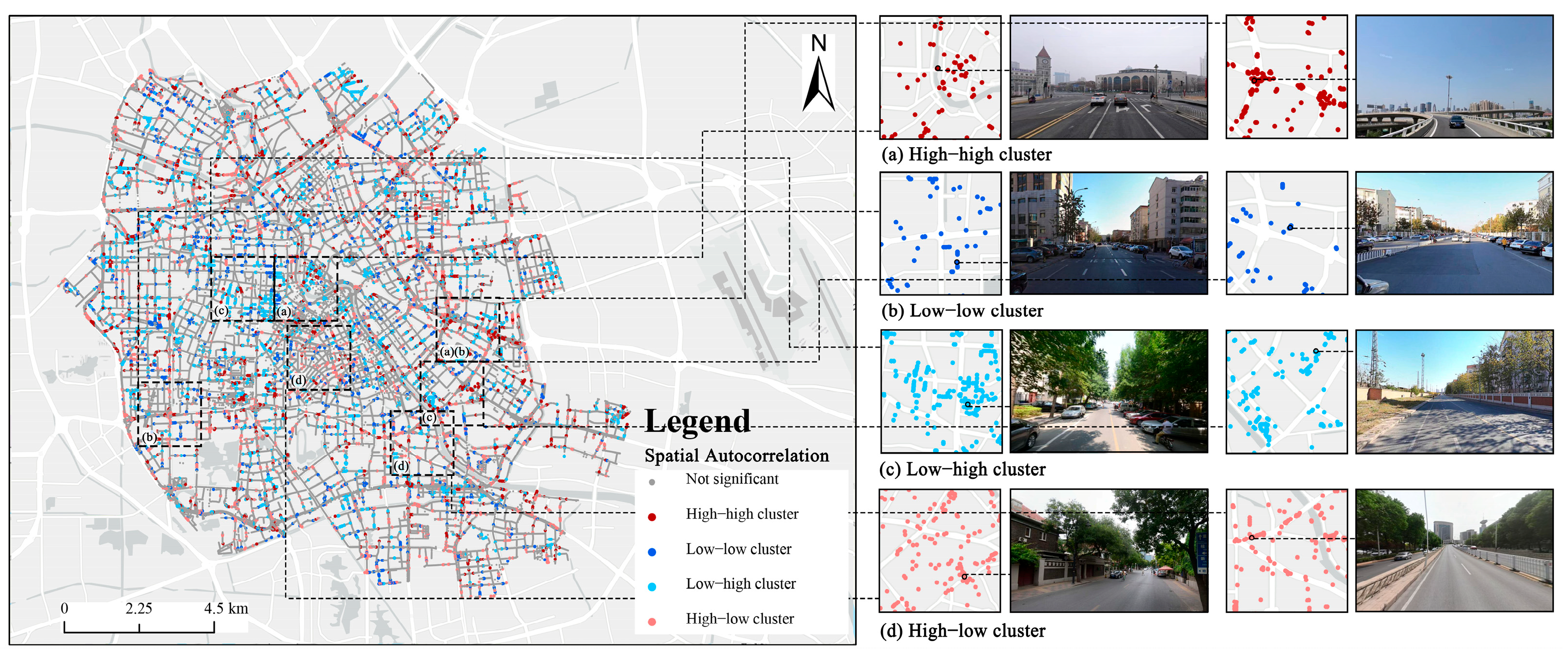 55. Sun, H.; Xu, H.; He, H.; Wei, Q.; Yan, Y.; Chen, Z.; Li, X.; Zheng, J.; Li, T. A Spatial Analysis of Urban Streets under Deep Learning Based on Street View Imagery. Sustainability 2023, 15, 14798. [Google Scholar] [CrossRef]