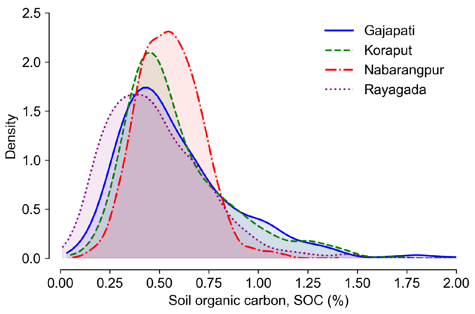 30]. This pattern is evident in the rice-dominated districts of Koraput and Nabarangpur, where intensive double-cropping practices coincide with lower SOC levels.