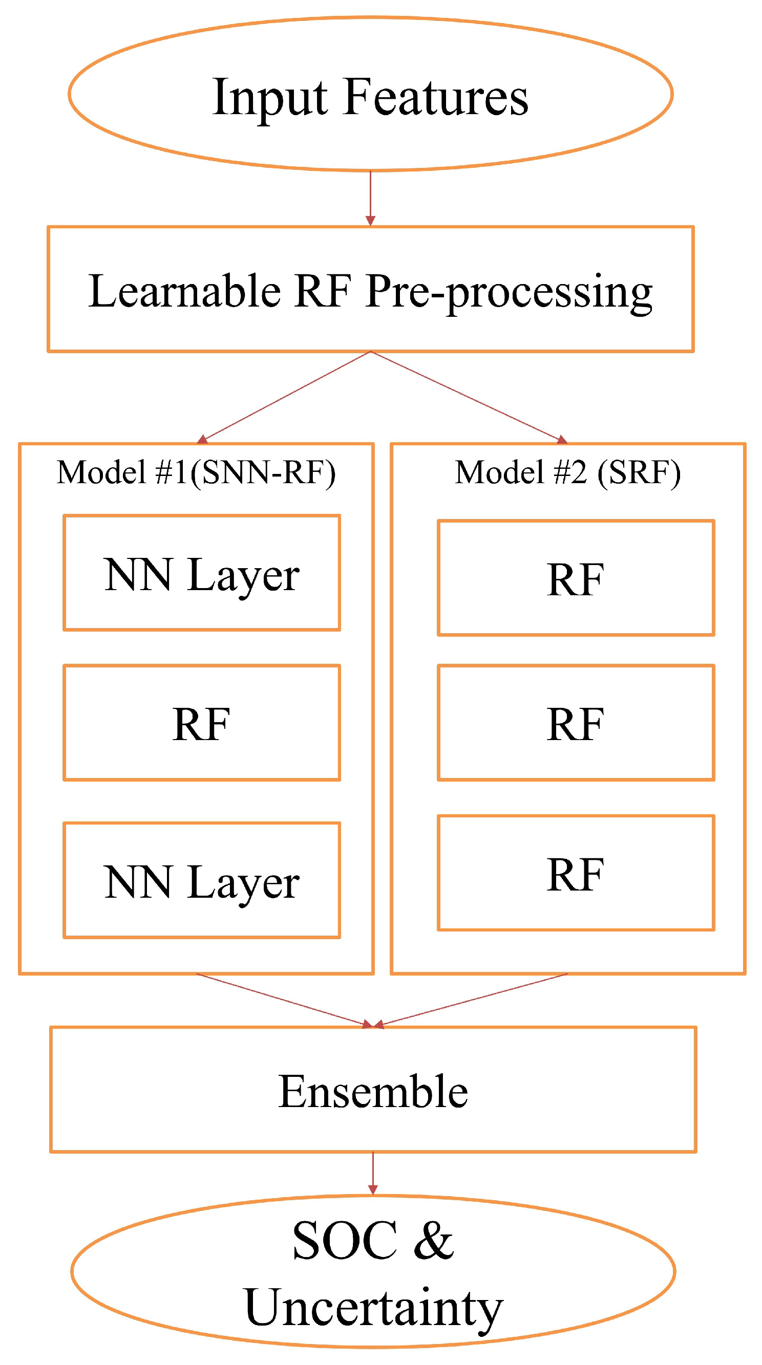 Ensemble Model Architecture Overview Model 1 (Sandwich Neural Network–Random Forest (SNN-RF)): This structure could be seen as a “sandwich” because you have two different types of models (NN) “sandwiching” a third model (RF) in the middle. A novel hybrid model, termed the SNN-RF, was developed. This architecture comprises three layers: The input layer receives the extracted SAR features. Hidden Layer (RF): A Random Forest (RF) layer is embedded within the neural network. The RF layer learns complex non-linear relationships between the input features and SOC, leveraging the strengths of tree-based models in capturing intricate patterns and non-linear interactions. Output Layer: A fully connected layer processes the output of the RF layer and generates the final SOC prediction. This could combine the strengths of both neural networks (for capturing complex patterns) and Random Forests (for handling feature importance and non-linearity).
