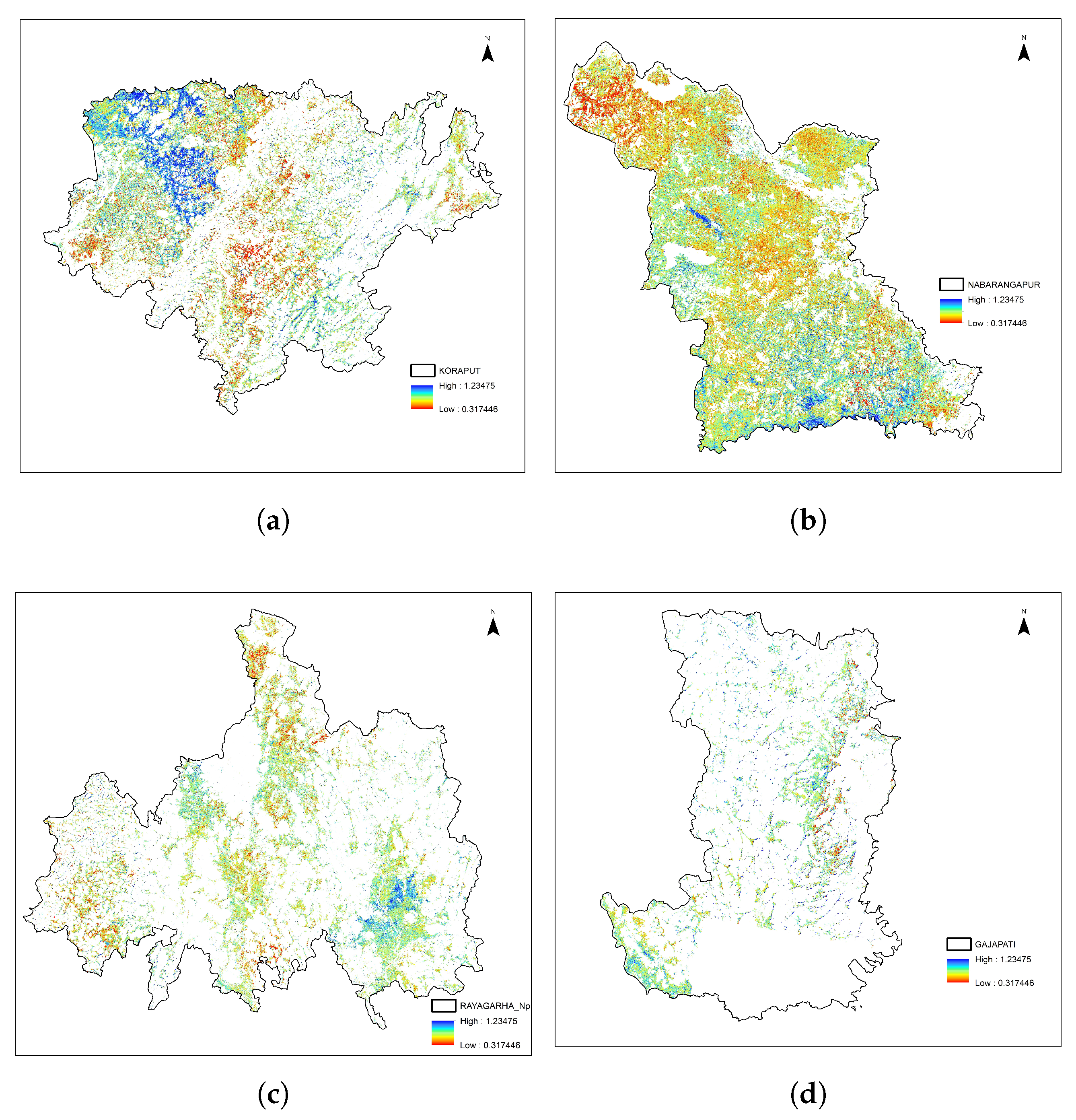 This study focuses on croplands in four districts of Odisha, India: Koraput, Nabarangpur, Rayagada, and Gajapati. These districts fall under distinct agroclimatic zones. Rayagada and Gajapati belong to the agroclimatic zone of the northeastern Ghats, characterized by a cultivated area of less than 0.1 Mha. In contrast, Koraput and Nabarangpur belong to the agroclimatic zone of the eastern Ghat mountains, and parts of Koraput extend into the southern Ghat zone. These two districts have a larger cropland area exceeding 0.2 Mha.