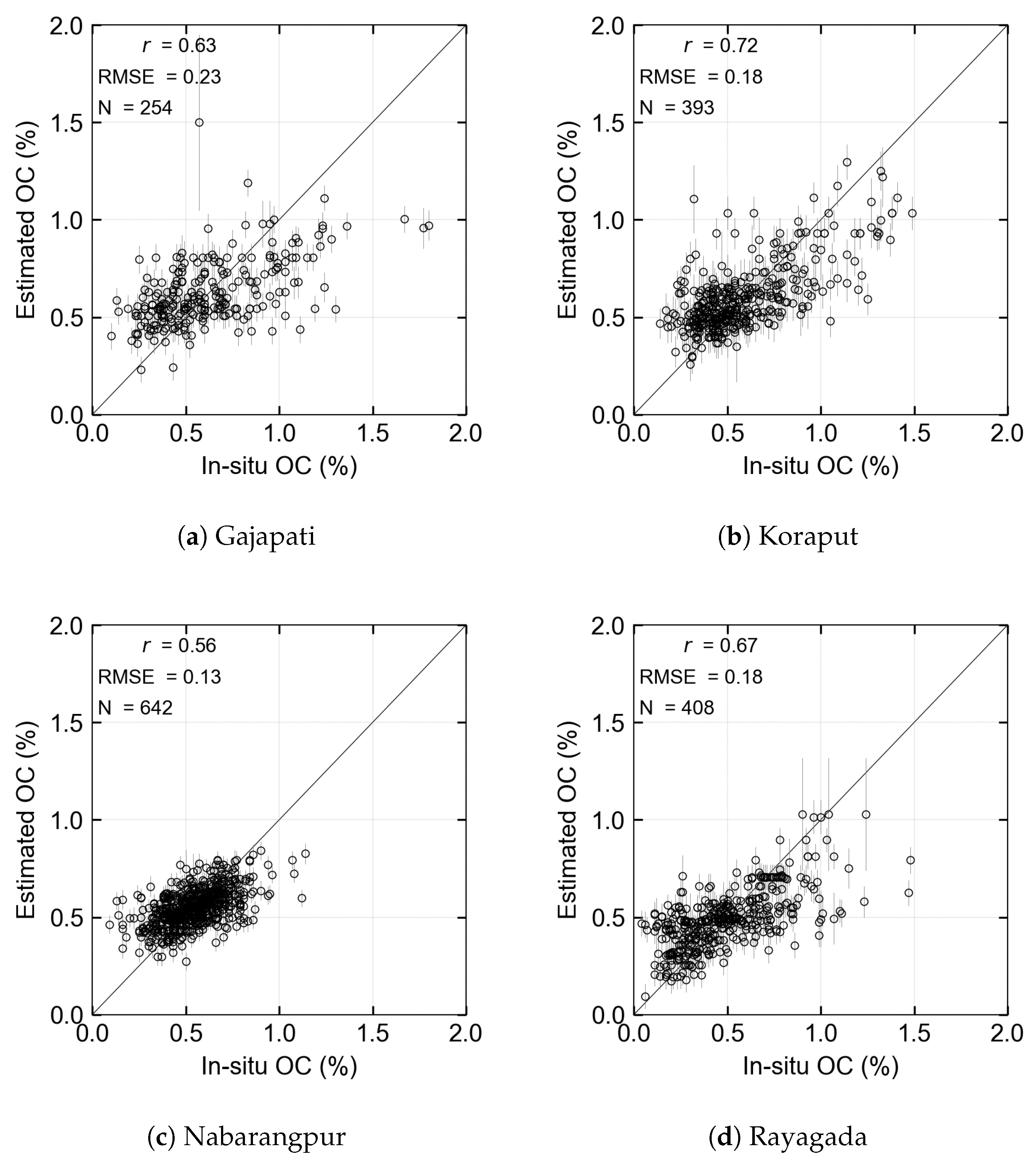 Rayagada exhibited a moderate positive correlation (r = 0.67), slightly lower than Koraput but still indicating a reasonable agreement between measured and estimated values. Gajapati had a lower correlation (r = 0.63), which could be attributed to a smaller sample size (N = 254) and the hilly terrain, introducing additional spatial variability. The weakest correlation was observed in Nabarangpur (r = 0.56). Despite its large sample size, the district’s high cropping intensity and complex variations in soil management practices likely introduced challenges in capturing SOC variations effectively, leading to reduced model performance.