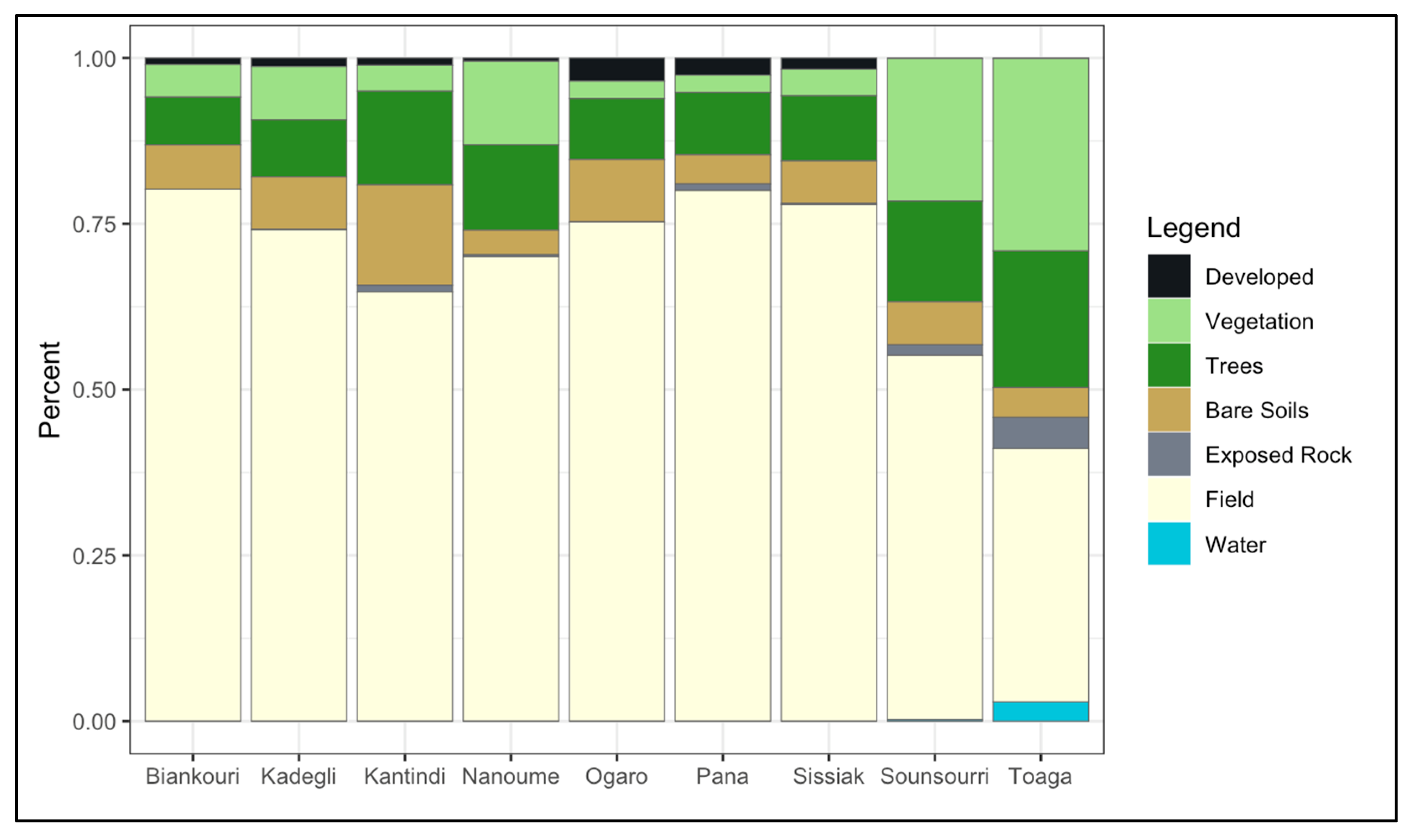 Figure 7). All sites but Toaga were classified as 50% agricultural fields. The developed and exposed rock classes were consistently the lowest percent covers for the sites. Only Sounsourri and Toaga had standing water (0.2 and 2.9%, respectively).
