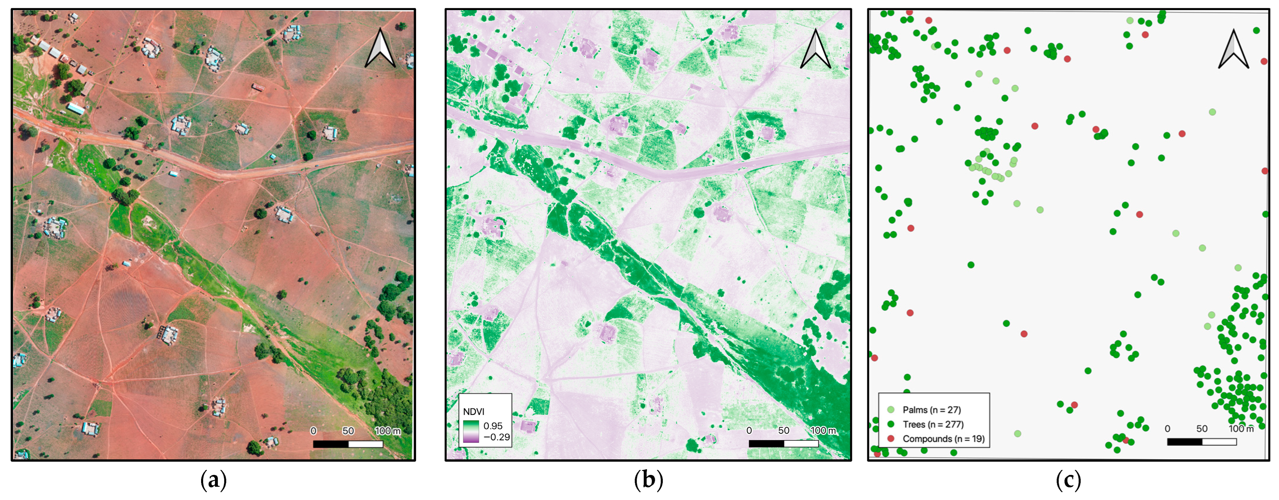 Individual trees are readily apparent in the drone imagery and one can easily differentiate among distinct types. The type, distribution, and spatial arrangement of trees indicate different land management practices. For instance, Sissiak featured a relatively low density of trees per hectare (10.10) but a very high number of palm trees (822) (