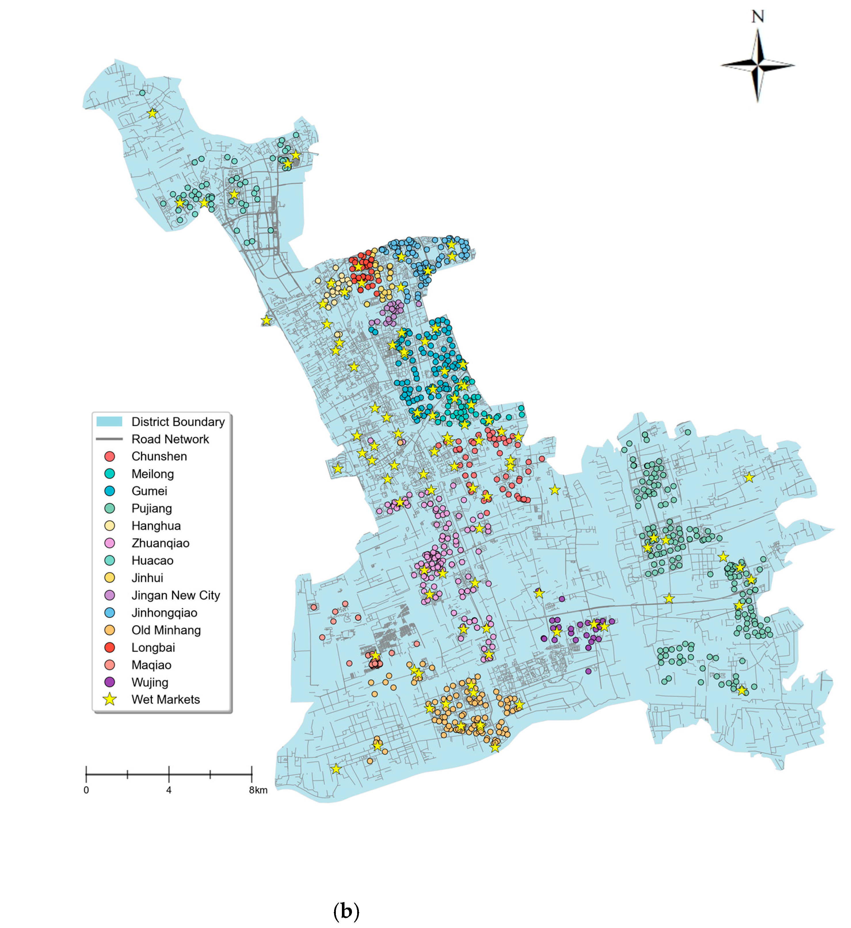 - Sun, B.L.; Zhang, H.; Li, L. The spatial distribution equity of wet markets in central urban district in Tianjin based on GIS analysis. Planners’ J. 2015, 31, 298–304. (In Chinese) [Google Scholar]