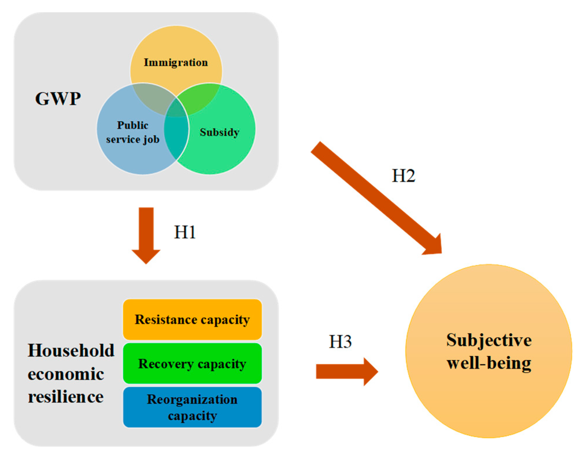 H3: Household economic resilience mediates the relationship between the GWP and subjective well-being.