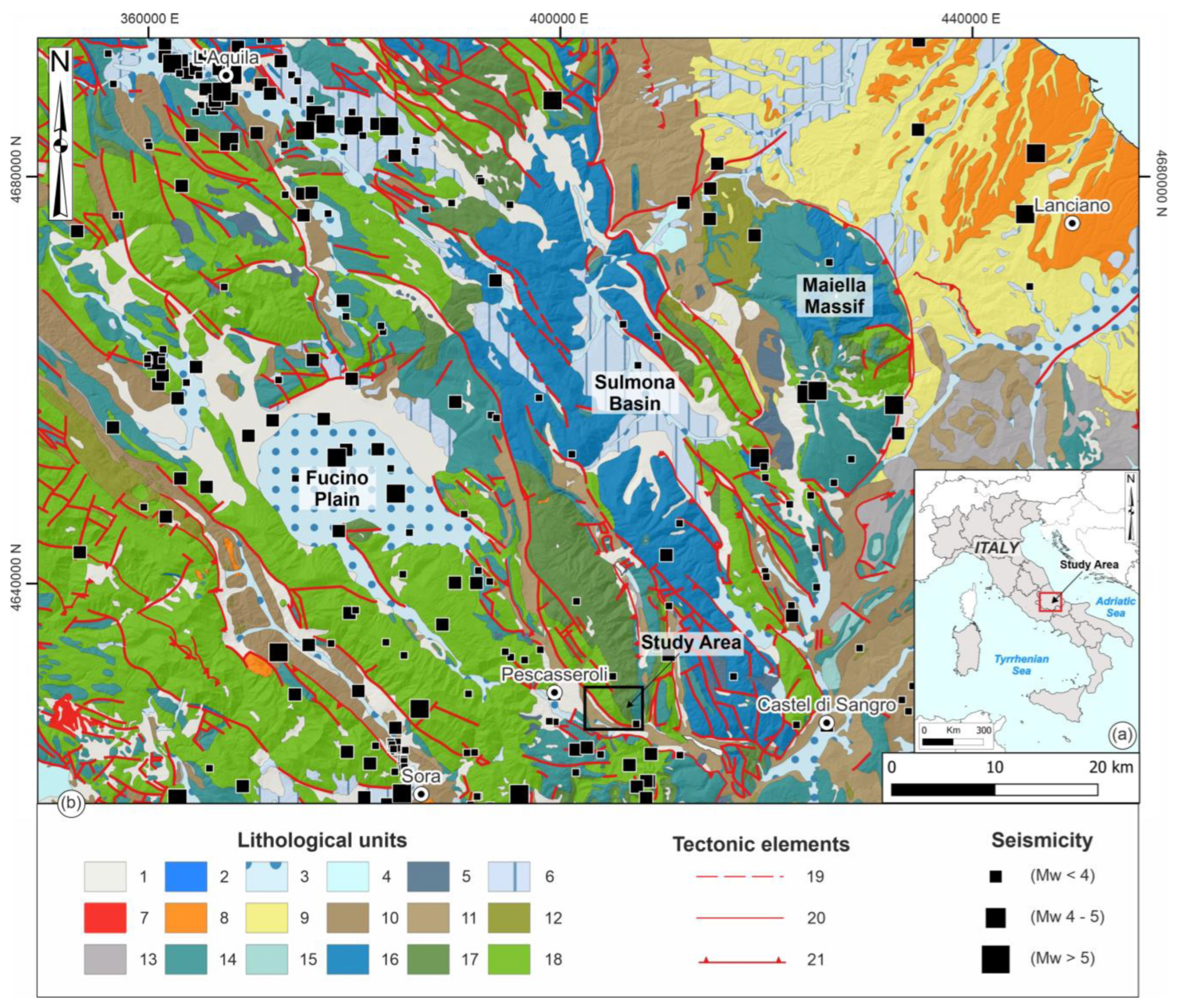 - Carabella, C.; Cinosi, J.; Piattelli, V.; Burrato, P.; Miccadei, E. Earthquake-induced landslides susceptibility evaluation: A case study from the Abruzzo Region (Central Italy). Catena 2022, 208, 105729. [Google Scholar] [CrossRef]