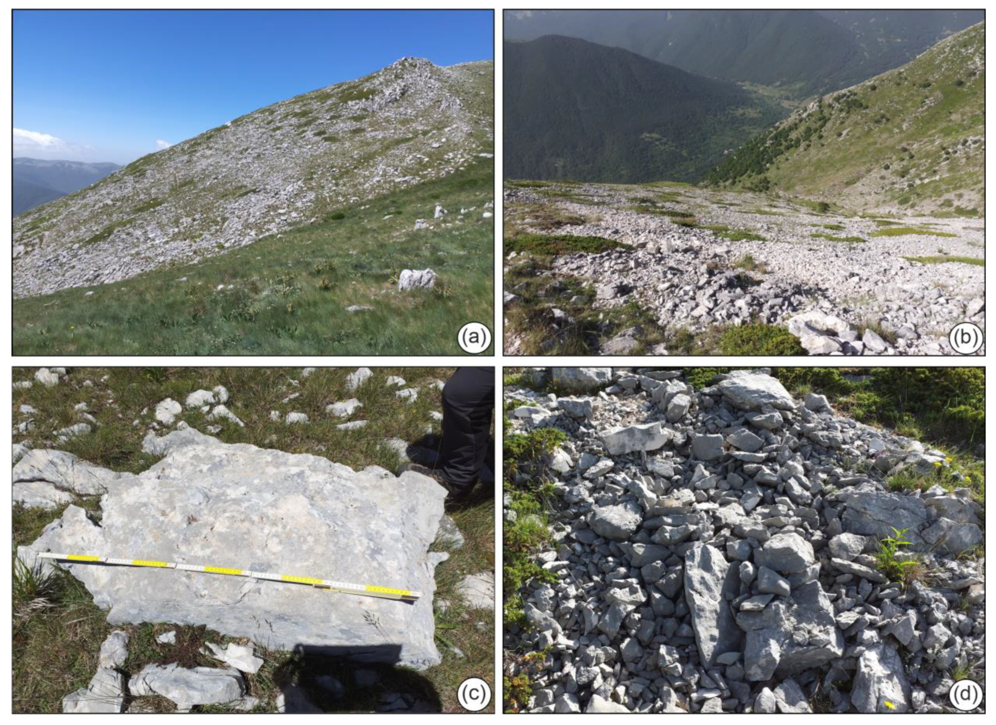 - Bianchi Fasani, G.; Di Luzio, E.; Esposito, C.; Evans, S.G.; Scarascia Mugnozza, G. Quaternary, catastrophic rock avalanches in the Central Apennines (Italy): Relationships with inherited tectonic features, gravity-driven deformations and the geodynamic frame. Geomorphology 2014, 211, 22–42. [Google Scholar] [CrossRef]