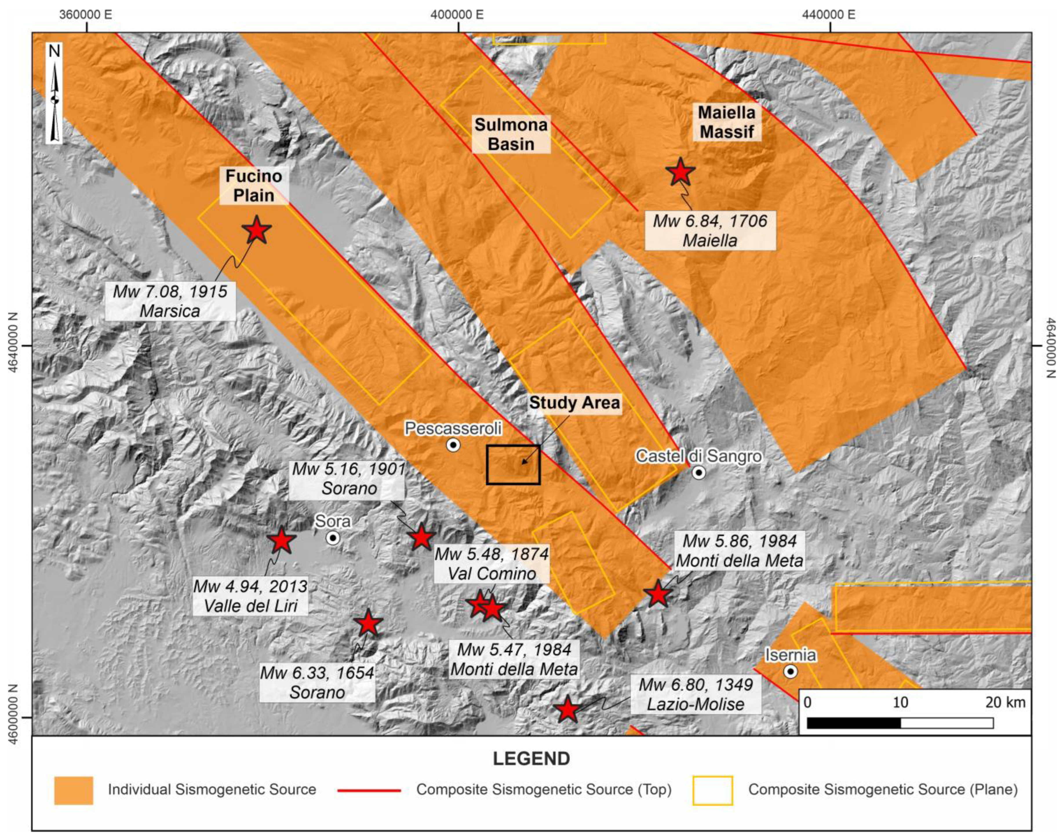 - Galadini, F.; Messina, P. Characterisation of the recent tectonics of the Upper Sangro River Valley (Abruzzi Apennine, Central Italy). Ann. Geofis. 1993, 36, 277–285. [Google Scholar] [CrossRef]