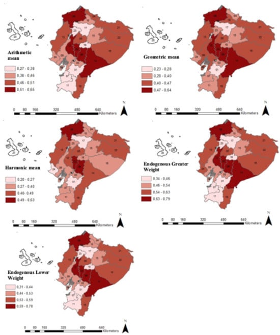 Social Vulnerability Index (SVI) in the provinces of Ecuador (2016) calculated using five aggregation methods: arithmetic mean, geometric mean, harmonic mean, and endogenous weighting approaches. Source: Own elaboration based on INEC [86].