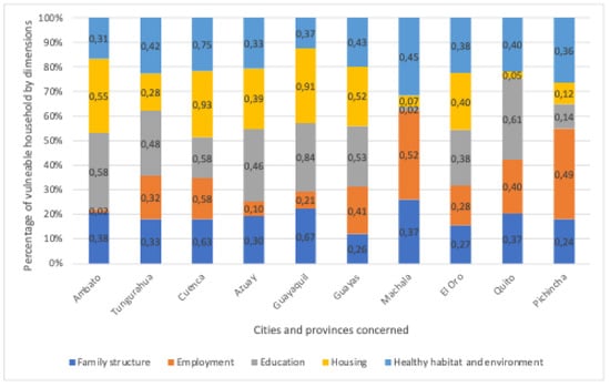 The graphs indicate that the urban territories maintain the same behaviour in terms of vulnerability as the corresponding provinces; however, some dimensions such as Housing and Education Conditions/Services show the existence of greater deficiencies in cities than in their corresponding provinces, since these territories have greater agglomerations of people or households that do not necessarily have access to optimal living conditions, one of the factors being internal migration, which according to Alvarado, Correa & Tituaña [94], is one of the main reasons for the accelerated process of urbanization in the country.