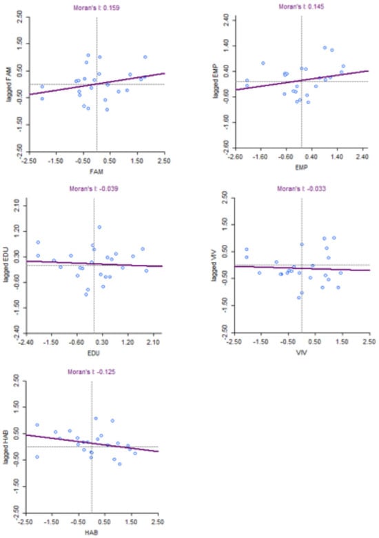 Dispersion graph of the Moran index for the SVI dimensions in the provinces, 2016. Source: Own elaboration based on ENEMDU [86].