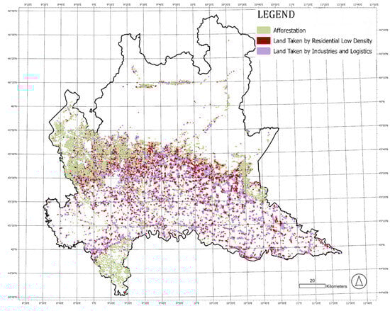 To limit these impacts, with the approval of a specific law—Regional Law 31/2014, new regulations were introduced in territorial governance to limit land taken in agricultural areas and promote the regeneration of already urbanized areas [72]. But since Law 31/2014 does not restrict land take before it happens, compensatory measures are mandated. To offset the environmental degradation caused by urbanization, afforestation measures were often implemented for landowners. Unfortunately, these processes were mainly located on agricultural soil, creating a double loss: environmental degradation and a rapid shrinkage in agricultural land’s productive capacity.