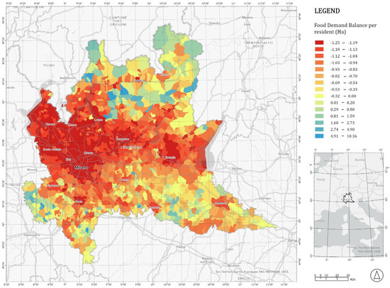 Figure 4 represents the balance between the land needed to satisfy food consumption and the quantity of available agricultural land for each municipality in Lombardy.