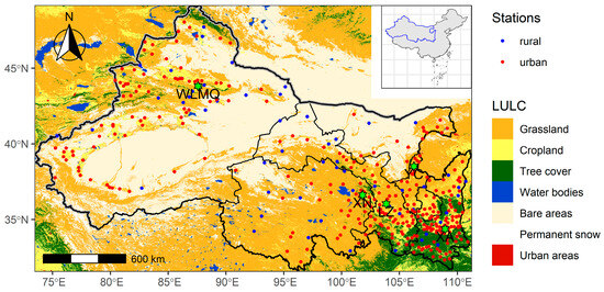 Figure 1. Spatial distribution of rural and urban stations in NWC. The study area encompasses the entirety of Xinjiang, Shanxi, Gansu, Qinghai, and Ningxia, as well as the western part of Inner Mongolia. The LULC in this map is down-sampled to a resolution to by the mode method because of the huge amount of data caused slow calculation speed. The thick black solid line with gray shadow is the national boundary, the thin solid line is the provincial boundary. In this figure, the abbreviations XA, WLMQ, XN, LZ, and YC refer to Xi’an, Urumqi, Xining, Lanzhou, and Yinchuan, respectively, and are marked with green stars on the map. The blue line in the inset denotes the study area boundary. Due to the excessive number of LULC types, the legends in this figure are overcrowded and overlap with one another. Therefore, the LULC types were reclassified into seven major categories. During the reclassification process, the original urban areas, permanent snow, water bodies, and bare areas were preserved, and the remaining LULC were reclassified into three categories: grassland, cropland, and tree cover. For example, the LULC of deciduous broadleaved tree, deciduous needleleaved tree, and mixed leaf type (broadleaved and needleleaved) were reclassified as tree cover. - The LULC dataset was sourced from the European Space Agency (ESA) Climate Change Initiative (CCI) Land Cover project (https://climate.esa.int/en/projects/land-cover/data/, accessed on 20 April 2023). Developed within the ESA CCI framework, this satellite-derived global product [19] provides continuous land surface characterization at a 300 m spatial resolution. The analysis utilized the 2020 LULC product, which encompasses 38 distinct LULC classes. Detailed class definitions include anthropogenic surface types (urban areas, croplands), vegetated domains (tree-covered, grassland), and natural features (bare soil, water bodies), etc. [19].