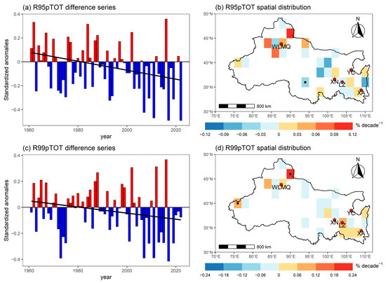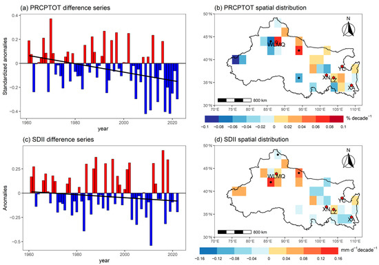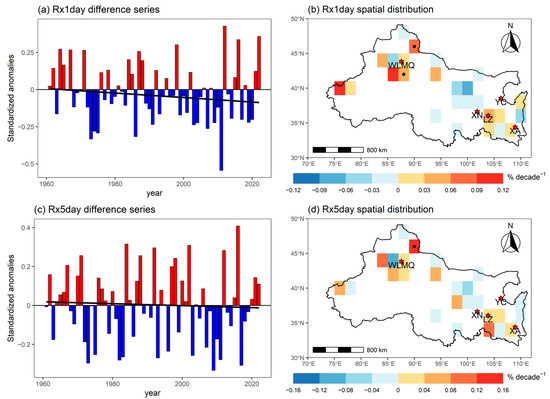 Annual time difference series (a,c) of relative threshold indices between all stations and rural stations in NWC over 1961–2022, along with the corresponding urbanization impact of grid cells (the trends of differences for all stations series minus rural stations series) (b,d). Each grid cell contains at least one rural station and one urban station. Solid dots within the grid cells indicate trends statistically significant at the 5% level. In the above figures, the abbreviations XA, WLMQ, XN, LZ, and YC denote Xi’an, Urumqi, Xining, Lanzhou, and Yinchuan, respectively. Positive and negative values are shown in red and blue bars, respectively, while the fitted trend line is indicated by a black solid line.