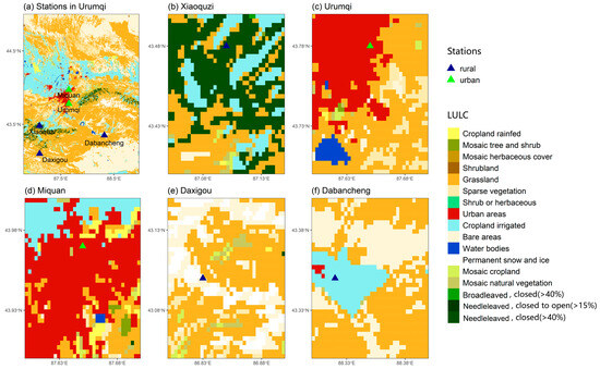 Urumqi is equipped with five national meteorological stations, of which two are in urban areas, namely the Miquan and Urumqi stations, while the remaining three, namely the Xiaoquzi, Daxigou, and Dabancheng stations, are situated in rural areas. This configuration results in a well-balanced ratio of urban to rural stations, facilitating robust comparative analysis. The spatial distribution of these meteorological stations in Urumqi, along with the associated LULC types in the surrounding regions, are shown in Figure 6.
