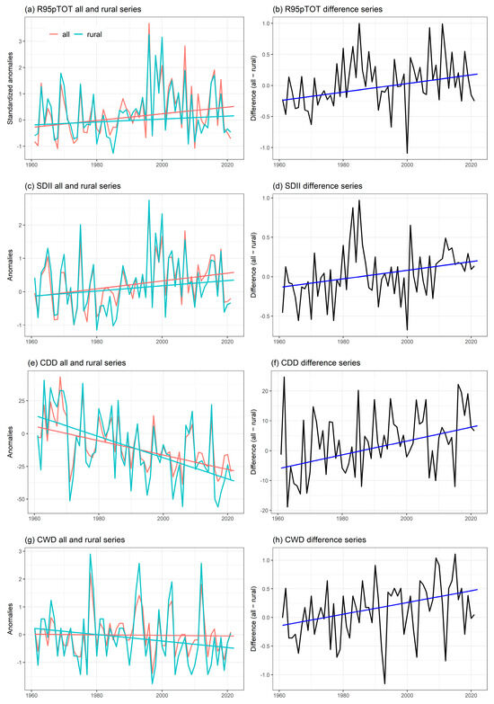 Secondly, it can be noted that the R95pTOT and R99pTOT contain more negative grid trends (i.e., the urbanization effect) of difference series between all station series and rural station series, as shown in Figure 2b,d. Furthermore, spatial distribution patterns analysis revealed different urbanization effects, with statistically significant positive and negative effects ( 0.05). Only one grid cell is identified as statistically significant in the R95pTOT index, and the R99pTOT index only has two grids that show an upward trend and are statistically significant. However, although not many grid cells with statistically significant urbanization effects were identified, the urbanization effects on these two relative threshold indices within the region were indeed statistically significant.