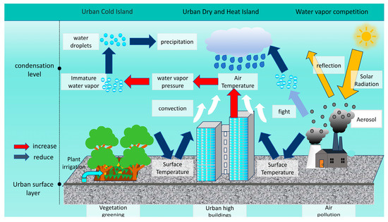 Figure 8. Possible mechanisms for why urban areas in the NWC generally receive less precipitation than rural areas. - It is also possible that the aerosol competition mechanism in urban areas plays a role. Due to urban traffic and industrial pollution, cloud droplet particles may decrease because of the excessive cloud condensation nuclei in urban areas compared to rural areas. The merging of cloud droplets is suppressed, slowing down the rate of cloud droplet transformation into rain droplets and causing less precipitation [30,31,32,33]. The radiation effect of aerosols can reduce the radiation reaching the ground, thereby reducing the energy used for evaporating surface water bodies and convection, resulting in reduced water evaporation and weakened convection in urban areas. The heat that is not reflected into space by aerosols is absorbed by the upper atmosphere, stabilizing the low-layer atmosphere and suppressing the generation of convective clouds [34,35] (Figure 8).