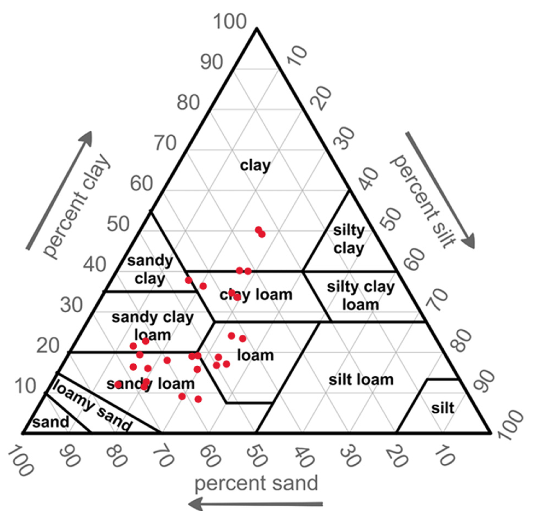 Figure 4 shows the soil texture of our soil samples (red points). The total of 28 data points rests on the fact that each soil sample was duplicated during laboratory analysis, and triplicated in the case of organic matter assessments to ensure reliability and reproducibility.
