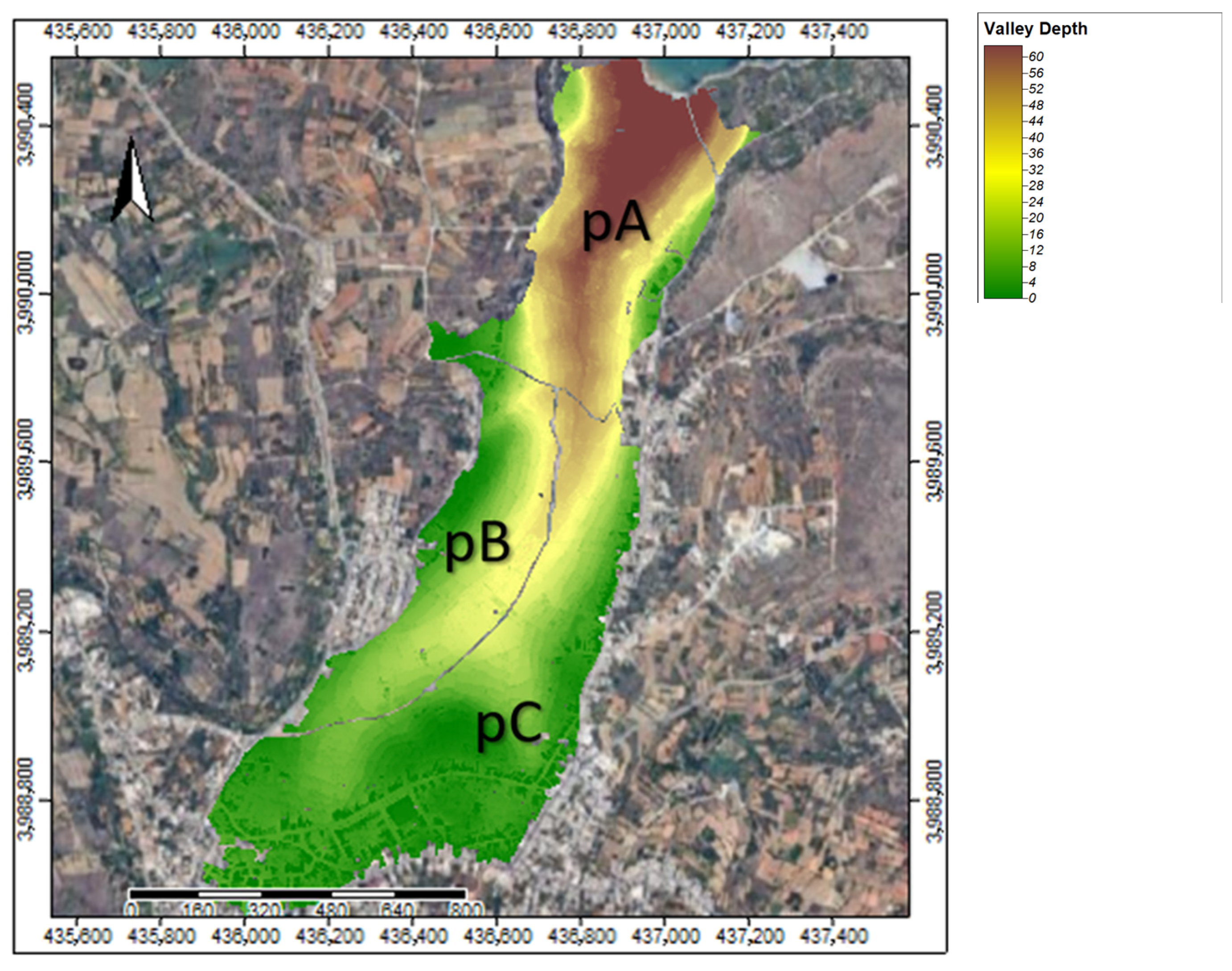 12], this valley has for a long time featured terraced agriculture and related hydrological intervention. Elevations range from sea level to approximately 138 m, with average slopes exceeding 15%, and local relief defined by short, steep hillsides. The catchment’s geology features a sequence of Upper Coralline Limestone overlying Globigerina Marl, with intervening patches of Blue Clay, resulting in variable soil textures and drainage patterns [