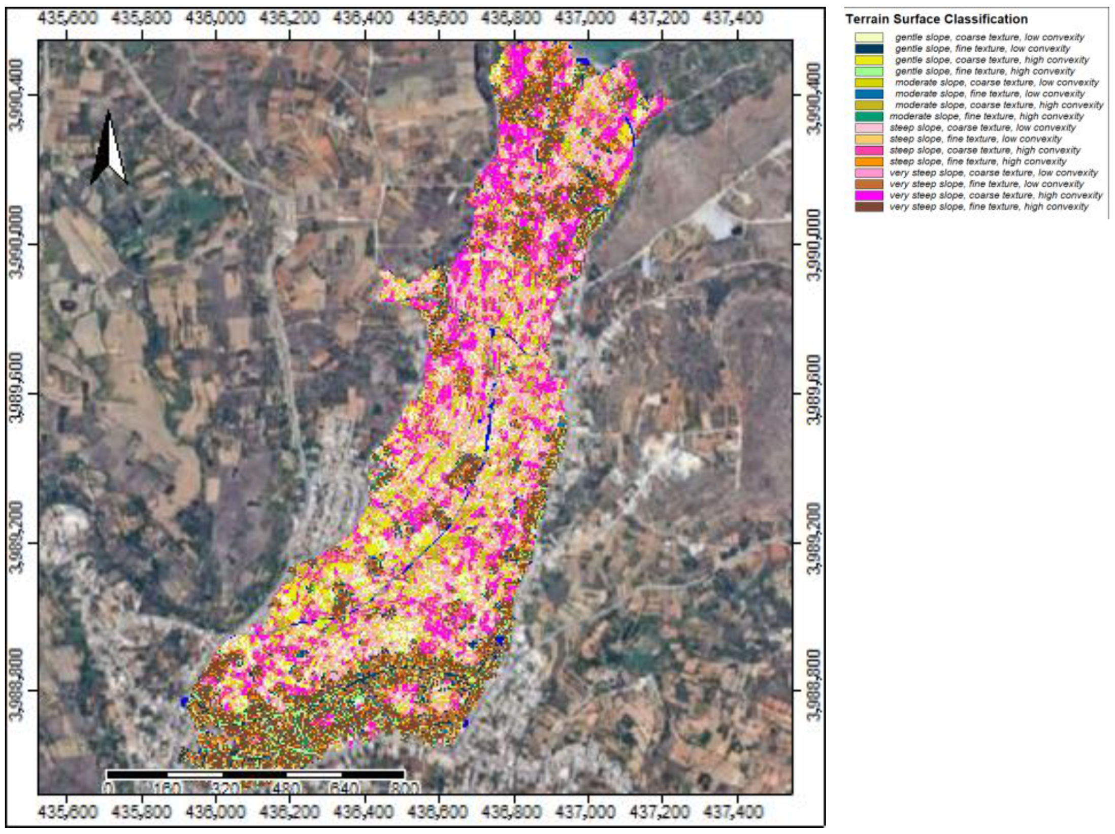 2), a grid resolution of 1 m was used to preserve terrain detail without introducing excessive noise. Geomorphological and terrain derivatives such as slope, slope-length, watershed, stream channels, topographical wetness index, surface terrain classification, and flow accumulation were subsequently computed in SAGA-GIS.