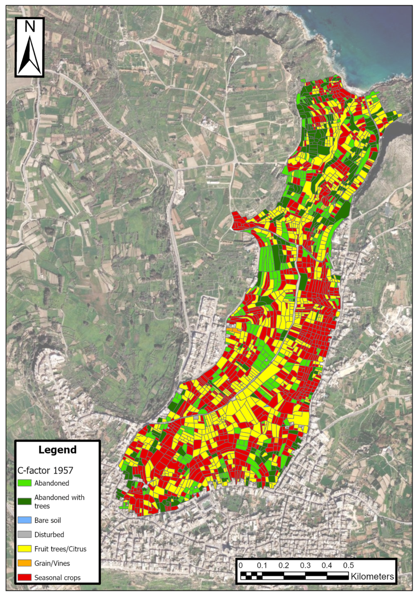 11] which implemented for the first time a GIS-RUSLE analysis of the estimated current and future soil loss at the Ramla watershed using 1 m national Light Detection and Ranging (LiDAR) data, ground-truthing, local soil data and climate projections of precipitation. By digitizing past land uses, reconstructing terrace patterns, and validating modern soil properties with laboratory tests, the present study aims at establishing a new and rich spatio-temporal database of erosion risk within another agriculturally-important valley system. After doing so, we then extend and rearticulate our findings to emphasize their thematic significance in both National and Mediterranean soil systems, by linking empirical soil-loss estimates to emergent policy questions about terraced field restoration, sustainable farming, and climate adaptation.