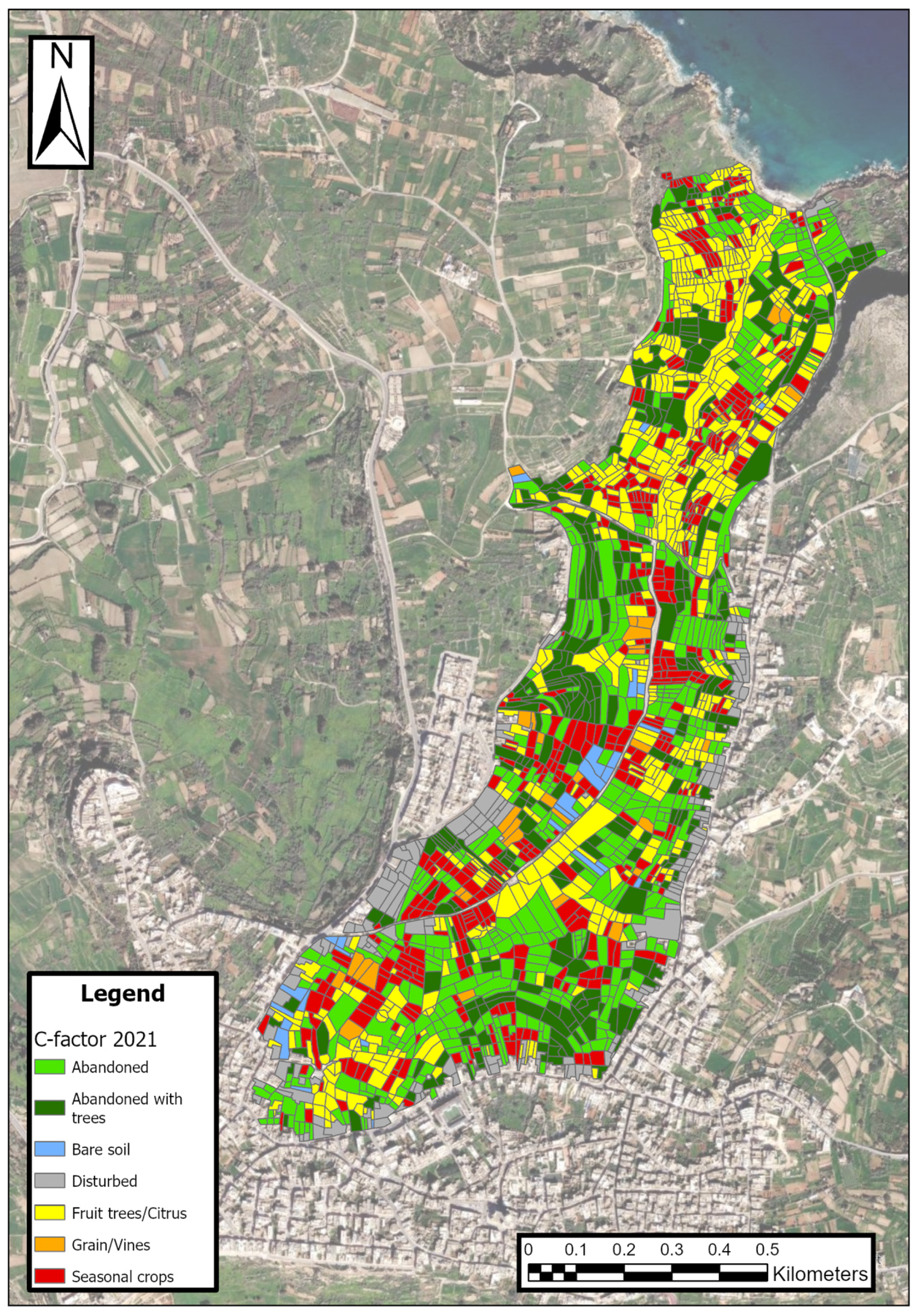 15], and local field work. Eight categories were identified: citrus orchards, open vegetable fields, fallow land, abandoned terraces, built-up areas, roads, semi-natural scrub, and bare soil.