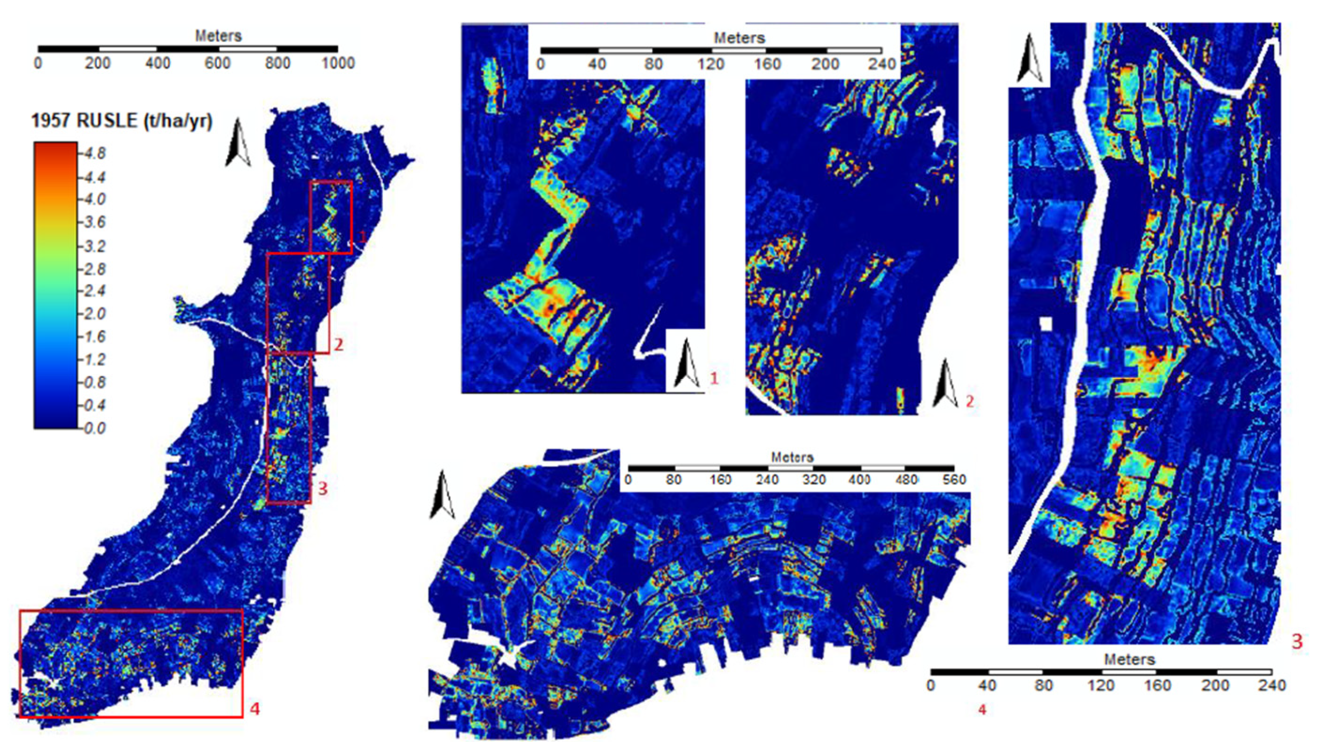 This study adopts a dual-year erosion modelling approach, comparing 1957 and 2021 to assess how changes in land-cover and management influence soil loss. The year 1957 was selected due to the availability of orthorectified Royal Air Force (RAF) aerial photographs with sufficient resolution to reconstruct terrace layouts and land cover. At the time of this study, the 2021 reference reflected the most recent full year for which ground truthing, LiDAR topography and meteorological inputs were available.